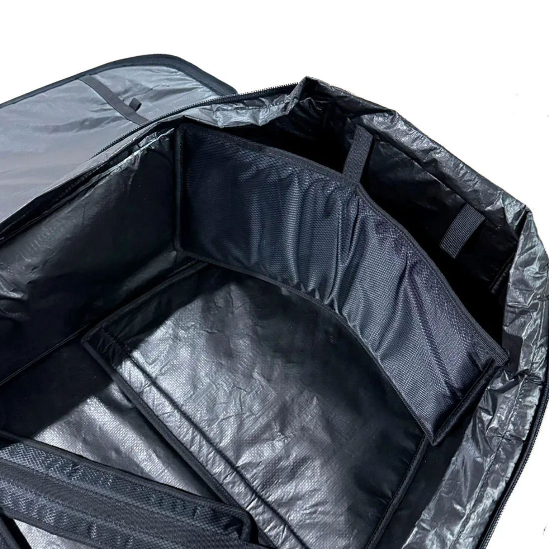 Internamente, a capa possui divisórias acolchoadas, alças de fixação para as pranchas e bolso interno para acessórios, garantindo organização e proteção adicional durante o transporte.