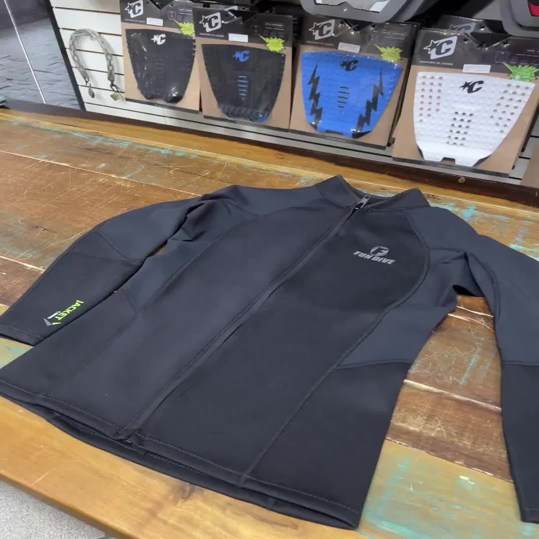 A Jaqueta de neoprene Fun Dive utiliza neoprene de 1,5 mm por toda peça. Além disso essa jaqueta contém um atributo difícil de encontrar em veste de neoprene, que é o bolso fechamento frontal em zíper, que facilita muito para vestir a veste. A camisa de neoprene é muito confortável, leve e resistente. Os braços e ombros são produzidos com neoprene super strech (flexível) para maior mobilidade na remada.