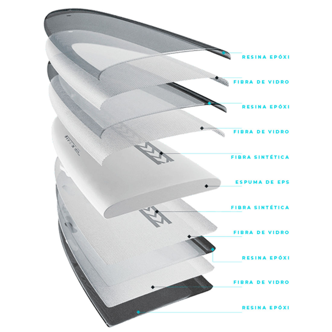 Última tendência mundial na fabricação de pranchas de surf, a tecnologia “Stringerless”, que substitui a longarina, por uma série de reforços de fibra sintéticas e fibras estruturais. Além dos compostos estruturais e núcleo de EPS de alta densidade. É laminada com 2 camadas de fibra 04 OZ + 06 OZ no deck, e 2 camadas de 04 OZ no botton, e resina Epoxi de última geração.